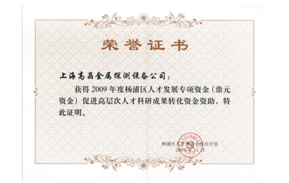 2009年杨浦区人才发展专项资金证书