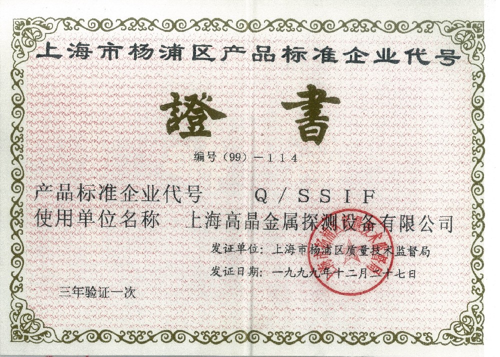 1999年产品标准企业代号证书